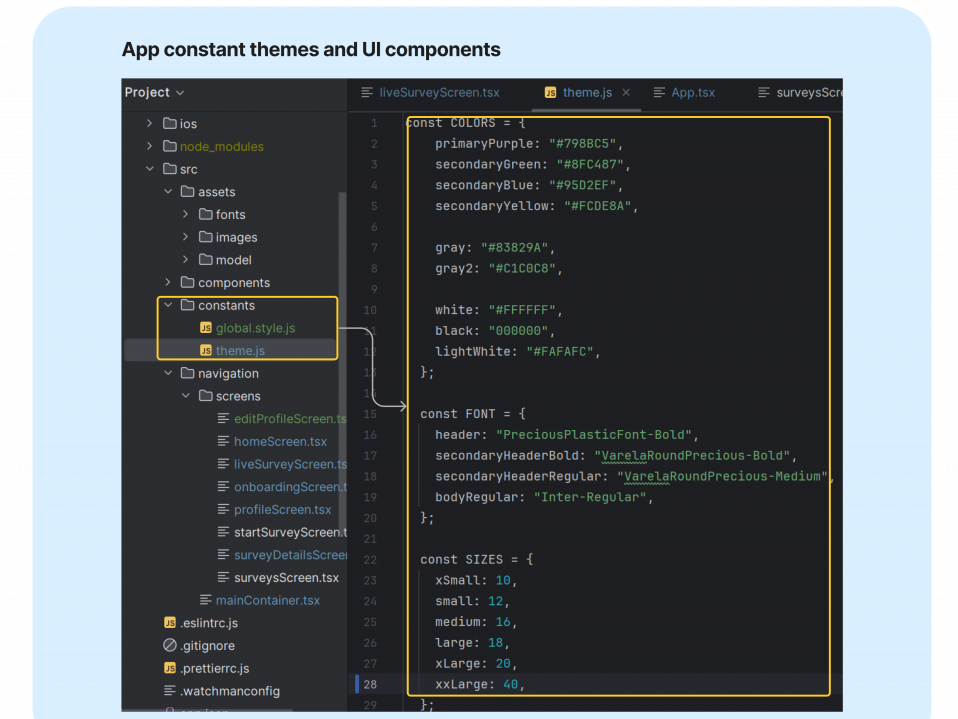 How I think about styling is very CSS-driven. Luckily, react-native works very similarly to CSS, allowing me to create a ‘global’ file in which I would code the elements (components in react) that are repeatedly used across the app, such as fonts, main CTAs, and some common styles. I also created a ‘themes’ file, which would host the values of those elements created in the global file. This is very powerful because it allows me to style in a single file, components that can be present on different screens.